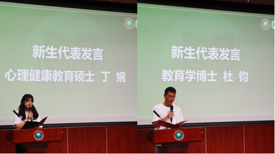 在庄严的国歌声中,开学典礼拉开帷幕。学院新生代表、2024级心理健康教育硕士生丁婉代表全体新生表达了为教育事业贡献青春与智慧的学术理想,分享了“路虽远行则将至,事虽难做则必成”的人生格言。博士新生代表杜钧则讲述了他的北理故事,指出钻研学术在于坚持,要争做教育事业的领军人。